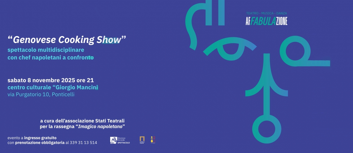 Uno spettacolo multidisciplinare che unisce teatro, musica, danza e sapori napoletani. "Genovese Cooking Show", con chef anpoletani a confronto, è ospitato da Arci Movie ed è realizzato all'interno della rassegna IMAGICO NAPOLETANO del progetto Affabulazione promosso dal Comune di Napoli e finanziato dal Fondo Nazionale per lo Spettacolo dal Vivo dalla Direzione Generale Spettacolo del Ministero della Cultura.