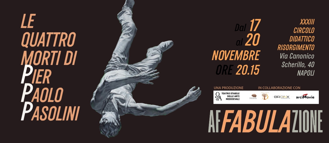 Nell’ambito di Affabulazione, progetto sostenuto dal Comune di Napoli con il contributo del Fondo Unico per lo Spettacolo della Direzione Generale Spettacolo del Ministero della Cultura, da giovedì 17 a domenica 20 novembre alle ore 20.15, va in scena in prima mondiale lo spettacolo Le quattro morti di Pier Paolo Pasolini di Gian Maria Cervo con la regia di Pep Gatell.